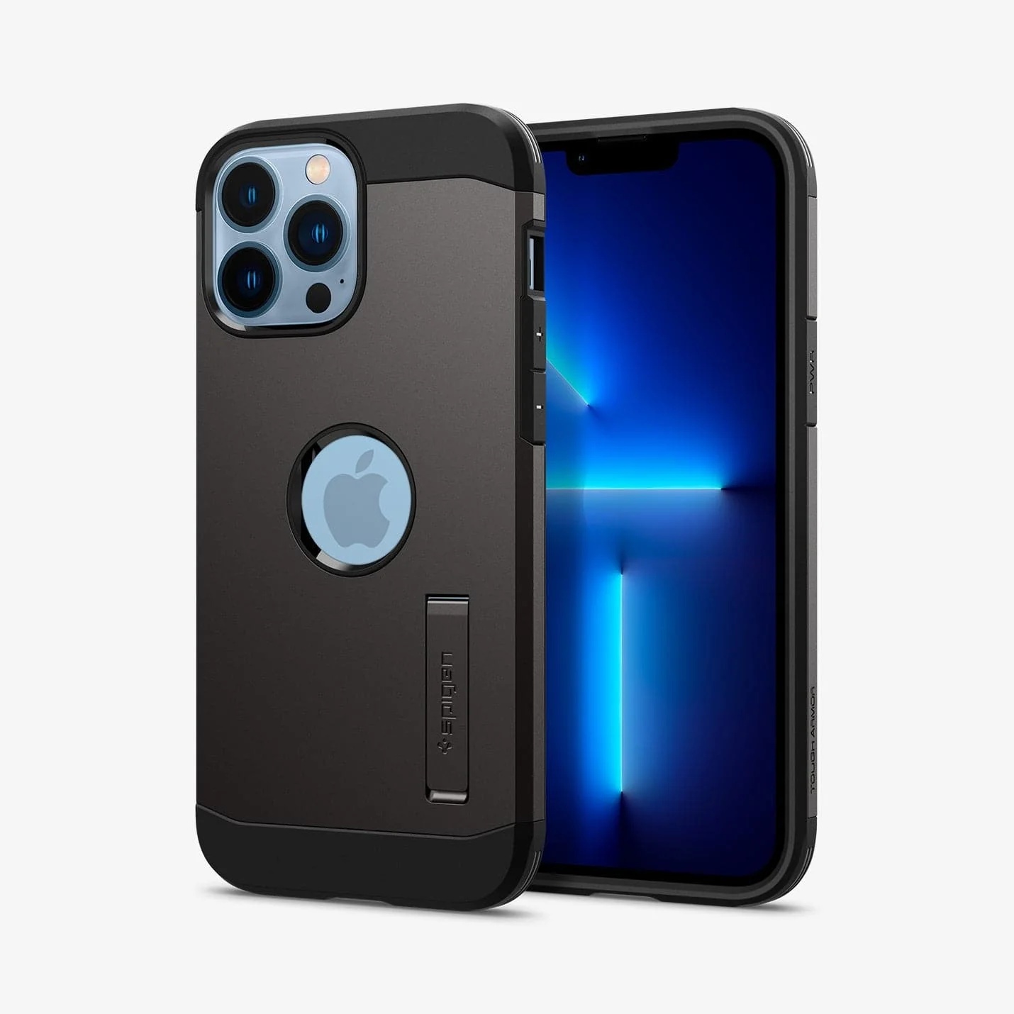 Spigen Tough Armor case features dual-layer protection (TPU + polycarbonate), an integrated kickstand for hands-free viewing, military-grade MIL-STD-810G drop protection, and precision cutouts for all ports and cameras. Available in multiple sizes.