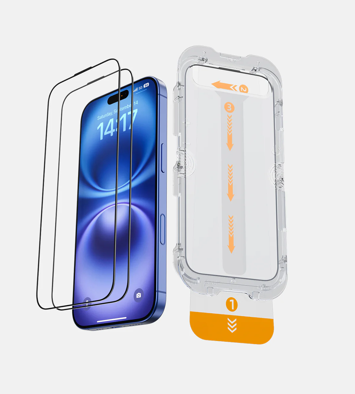 Premium tempered glass screen protectors with 9H scratch hardness and a 2.5D curved edge for a seamless fit. Oleophobic coating resists fingerprints and smudges. Includes a dust-removal kit and alignment tray for bubble-free installation. Each pack contains two protectors.